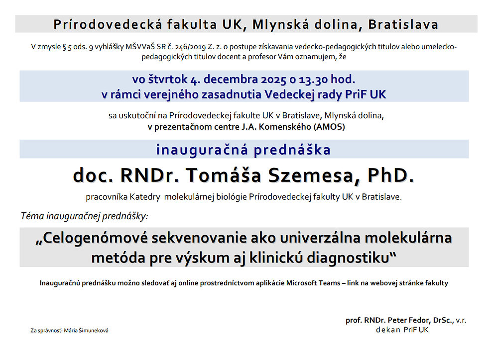 The Faculty of Natural Sciences of Comenius University warmly invites you to the inaugural lecture of doc. RNDr. Tomáš Szemes, PhD.